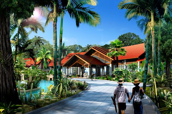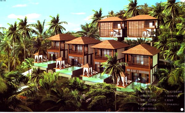 在度假村的規(guī)劃中,因地制宜,采用東南亞建筑風(fēng)格,并輔以中式元素和理念。既繼承東南亞建筑“自然,健康和休閑”的特質(zhì),又融合中國傳統(tǒng)建筑 的“平和,含蓄”。