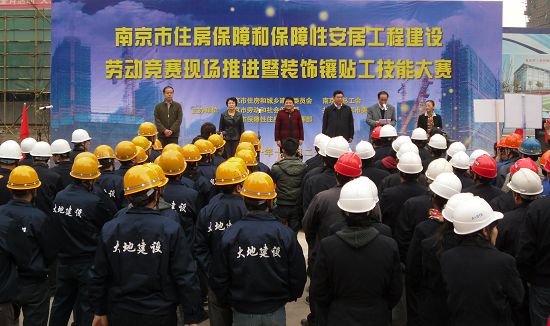 11月22日由南京市總工會、南京市人力資源和社會保障局、共青團南京市委員會主辦、南京市住建委、南京市城建工會、保障房建設指揮部承辦的南京市住房保障和保障性安居工程建設勞動競賽現(xiàn)場推進暨裝飾鑲貼工技能競賽活動在股份公司丁家莊匯杰02地塊項目部隆重舉行。02地塊項目經(jīng)理楊益民受股份公司江中明總經(jīng)理的委托,代表保障房承建單位發(fā)言,他在發(fā)言中表示:保障房建設是南京市貫徹落實國家關注民生要求的重要工程,一定要全力以赴不折不扣地按照保障房指揮部的要求,積極投身保障房勞動競賽活動,加大人力、財力以及科技力量的投入,不遺余力狠抓工程質(zhì)量、工程進度和安全管理,努力加快推進保障房建設的步伐”。并代表項目部承諾:“遵循用大地人的勤奮營造大地精品的管理理念建造讓南京市人民放心的保障房”。