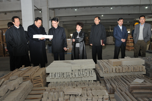 于國家董事長向何省長一行介紹文化石產(chǎn)品性能