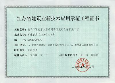 我公司承建的“侵華日軍南京大屠殺遇難同胞紀(jì)念館擴(kuò)建工程”于09年下半年通過(guò)了第六批全國(guó)建筑業(yè)新技術(shù)應(yīng)用示范工程的專(zhuān)家評(píng)審,結(jié)論為:應(yīng)用新技術(shù)的整體水平達(dá)到“國(guó)內(nèi)領(lǐng)先水平”。另外,本工程還被江蘇省建管局批準(zhǔn)為“江蘇省第一批綠色施工示范工程”。該工程應(yīng)用了建設(shè)部“建筑業(yè)十項(xiàng)新技術(shù)”的10大項(xiàng)17小項(xiàng),江蘇省新技術(shù)4項(xiàng),創(chuàng)新技術(shù)3項(xiàng)。該工程于近日取得了“江蘇省建筑業(yè)新技術(shù)應(yīng)用示范工程證書(shū)”。 |