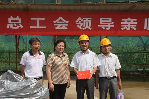 市總工會(huì)副主席閔慧、城建工會(huì)主席許華君等領(lǐng)導(dǎo)在匯杰新城保障房項(xiàng)目部工地親切看望慰問(wèn)奮戰(zhàn)在一線(xiàn)的施工人員,送上毛巾、香皂、礦泉水等防暑降溫物品。閔慧主席代表南京市總工會(huì)向冒著酷暑堅(jiān)守在工作崗位上的一線(xiàn)員工表示親切的慰問(wèn),并叮囑他們做好高溫防護(hù),勞逸結(jié)合,保重身體,確保夏季現(xiàn)場(chǎng)安全施工。閔主席還表示保障房的建設(shè)是市政府重點(diǎn)關(guān)注工程,大地建設(shè)有良好的企業(yè)傳統(tǒng),一定能建設(shè)出精品工程,為南京城市建設(shè)做出貢獻(xiàn)。