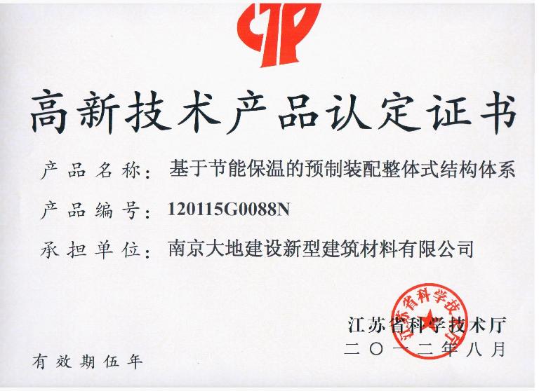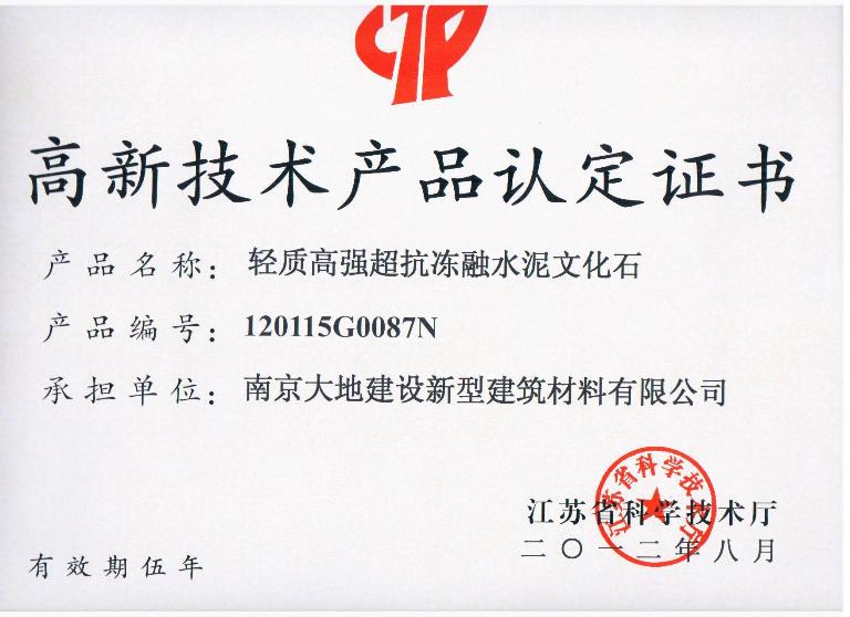 近日,由江蘇省科技廳組織的2012年江蘇省第二批高新技術(shù)產(chǎn)品認(rèn)定結(jié)果已經(jīng)公布。經(jīng)專家們的認(rèn)真評議、審核,南京大地建設(shè)新型建筑材料有限公司的三項(xiàng)產(chǎn)品憑借其綠色、節(jié)能、環(huán)保、優(yōu)質(zhì)等特性被認(rèn)定為高新技術(shù)產(chǎn)品。三項(xiàng)產(chǎn)品分別為:基于節(jié)能保溫的預(yù)制裝配整體式結(jié)構(gòu)體系(產(chǎn)品編號:120115G0088N)、PC節(jié)能保溫墻板(產(chǎn)品編號:120115G0089N)、輕質(zhì)高強(qiáng)超抗凍融水泥文化石(產(chǎn)品編號:120115G0087N)。