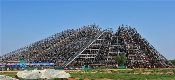 博物館工程分為鋼結(jié)構(gòu)屋蓋和內(nèi)部混凝土結(jié)構(gòu)兩部分。屋蓋鋼結(jié)構(gòu)類型為桁架梁柱+焊接球節(jié)點(diǎn)網(wǎng)架組成的折板殼結(jié)構(gòu)。混凝土結(jié)構(gòu)地上四層,結(jié)構(gòu)標(biāo)高+14.7m,長111m,寬56.5m,分為南北兩部分。外框架為桁架梁柱+焊接球網(wǎng)架組成的折板殼結(jié)構(gòu),結(jié)構(gòu)外形奇特,立面呈山巒造型,共有33個(gè)折面。由11組22榀桁架、11片網(wǎng)架和1個(gè)組合中心柱組成。桁架形成山脊,折板網(wǎng)架組成各種外形的坡面安裝在兩榀桁架之間。鋼結(jié)構(gòu)用鋼量約3000t。2010年6月在中國建筑科學(xué)研究院召開了鋼結(jié)構(gòu)安裝施工方案專家論證會(huì),5位國內(nèi)知名鋼結(jié)構(gòu)專家一致同意該方案通過論證。
