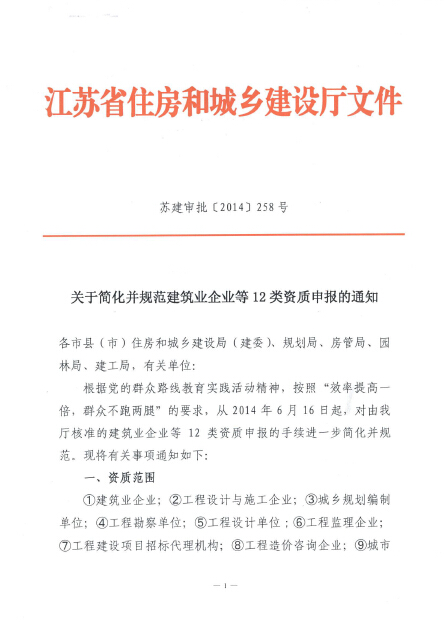 轉發(fā)蘇建審批[2014]258號《關于簡化并規(guī)范建筑業(yè)企業(yè)等12類資質申報的通知》