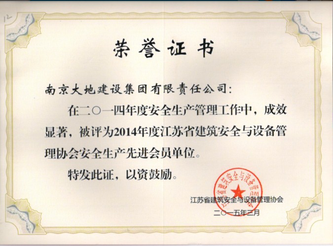 經(jīng)江蘇省建筑安全與設(shè)備管理協(xié)會(huì)第五屆理事會(huì)第十三次會(huì)議審議通過,南京大地建設(shè)集團(tuán)有限責(zé)任公司被授予“2014年度江蘇省建筑安全與設(shè)備管理協(xié)會(huì)安全生產(chǎn)先進(jìn)會(huì)員單位”的稱號(hào);龐長兵、江中明、胡直方三位同志被授予“2014年度江蘇省建筑安全與設(shè)備管理協(xié)會(huì)會(huì)員單位安全生產(chǎn)先進(jìn)工作者”稱號(hào)。