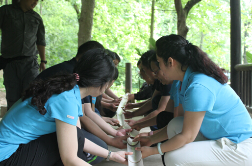 “驛站傳書”告訴大家的是完成一項(xiàng)任務(wù)的方式方法是各種各樣的,單一傳統(tǒng)的未必不可行,然而如果形成思維定式,那么創(chuàng)新求變是突破的必行之路。兩個(gè)隊(duì)伍,在所有人不說話以及前面人不許回頭的情況下,將一組數(shù)據(jù)由最后一名隊(duì)員正確地傳輸?shù)阶钋懊娴囊幻?duì)員。在嘗試了2組傳輸失敗的情況下,各種方法在不斷提出,激烈地碰撞出火花。兩隊(duì)同時(shí)想到了手機(jī)的信息傳遞方式。雖然完成任務(wù)在一瞬間變成再簡單不過,但活動過程值得深思。