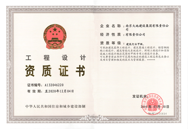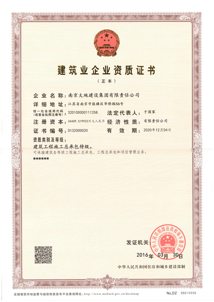 2016年4月15日上午,南京市城鄉(xiāng)建設(shè)委員會給我公司送來了“賀信”,祝賀大地建設(shè)成功晉升國家建筑工程施工總承包特級資質(zhì),成為南京市首家同時擁有建筑行業(yè)甲級設(shè)計資質(zhì)的特級企業(yè)。賀信中說:“南京大地建設(shè)集團(tuán)有限責(zé)任公司申報特級資質(zhì)取得成功,為承上啟下我市建筑業(yè)發(fā)展‘十二五’和‘十三五’規(guī)劃起到完美收官和良好開局的作用,為全市建筑施工企業(yè)晉升特級資質(zhì)樹立了傍樣!