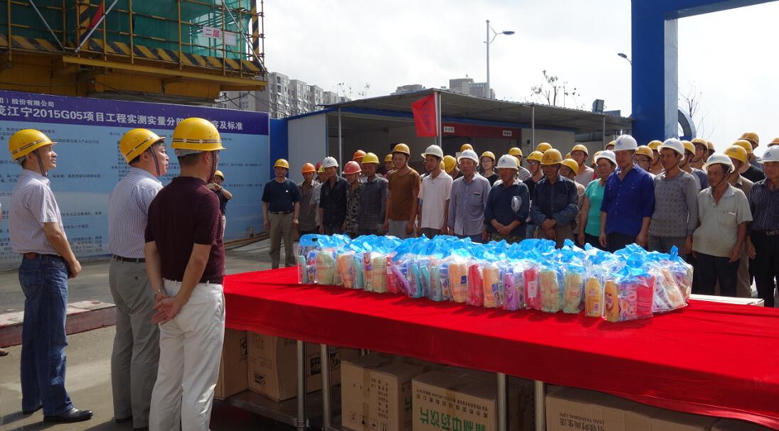聞慶武 、劉斌兩位領(lǐng)導(dǎo)在江寧世茂項(xiàng)目部工地親切看望慰問奮戰(zhàn)在一線的施工人員,與現(xiàn)場(chǎng)施工的工人們親切握手,并把毛巾、香皂、洗發(fā)水等慰問品送到了施工工人手中,對(duì)他們不畏高溫、堅(jiān)守崗位、辛勤勞動(dòng)表示誠摯感謝,并親切叮囑工人們高溫期間要注意勞動(dòng)保護(hù)和安全。兩位領(lǐng)導(dǎo)還向現(xiàn)場(chǎng)施工負(fù)責(zé)人詳細(xì)詢問了工程進(jìn)展和施工人員的生活條件等有關(guān)問題,囑咐各有關(guān)部門要合理安排時(shí)間,避開高溫時(shí)段施工,給施工人員足夠的睡眠,盡可能的為他們創(chuàng)造涼爽的休息環(huán)境,保持充沛的精神,繼續(xù)為建設(shè)美好南京貢獻(xiàn)力量。