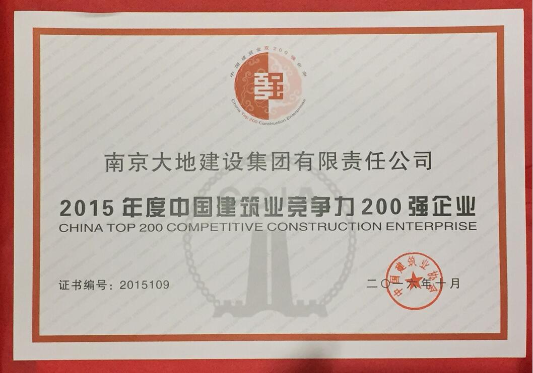我公司榮獲2015年度中國建筑業(yè)競爭力200強(qiáng)企業(yè)第109名,既是大地建設(shè)在過去一年的成績單,更是社會(huì)和業(yè)內(nèi)對(duì)公司的認(rèn)可。我公司決心再接再厲,再創(chuàng)佳績。