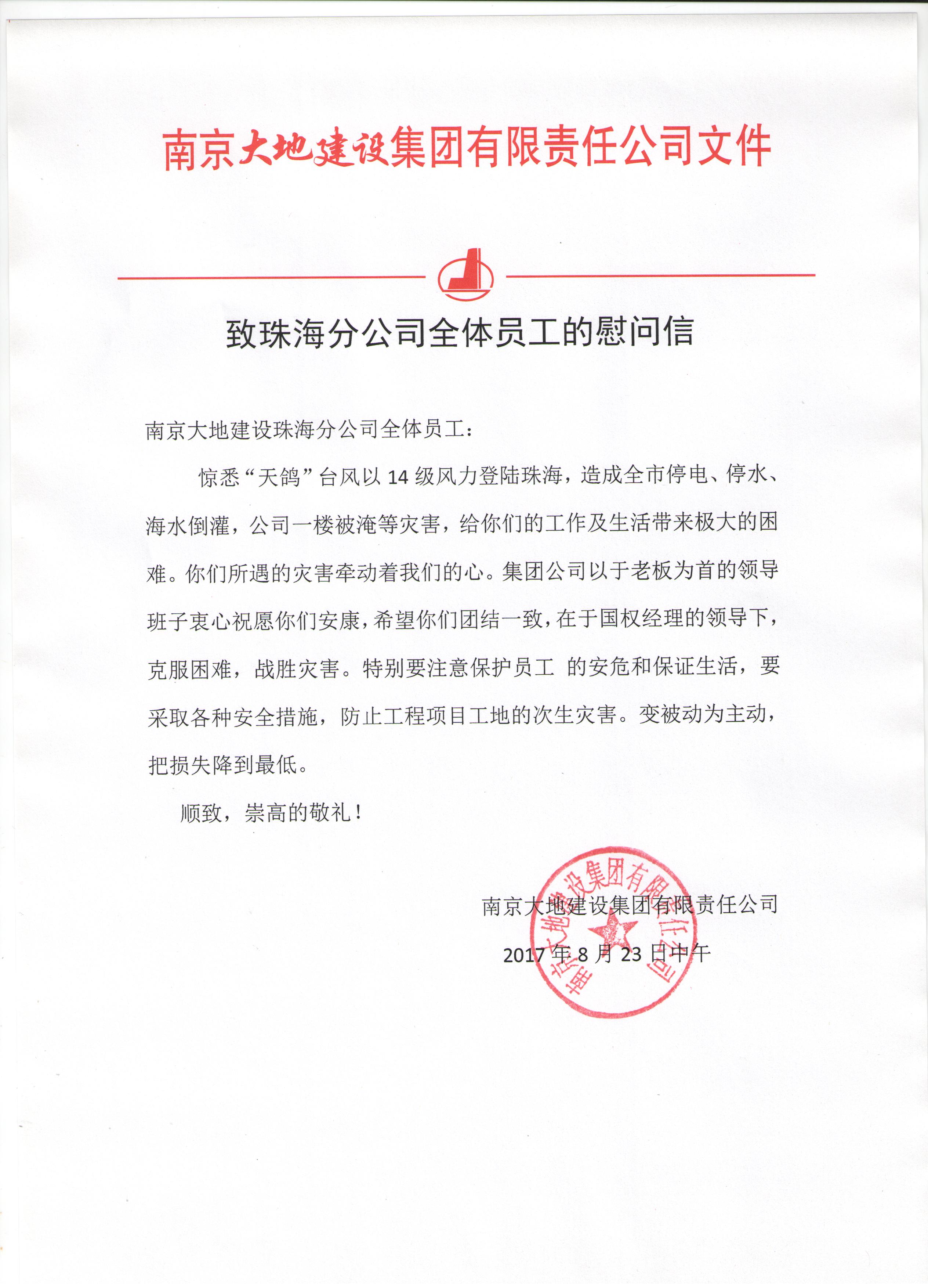 “天鴿”臺風(fēng)過后,集團公司致珠海分公司全體員工的慰問信