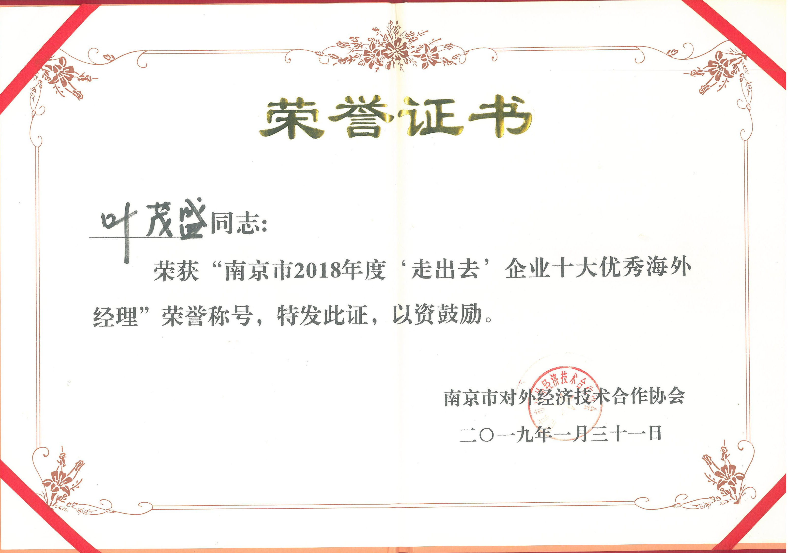 近日,南京市商務(wù)局、南京市外經(jīng)協(xié)會(huì)為獲得“南京市2018年度‘走出去’企業(yè)十大優(yōu)秀海外經(jīng)理人”的個(gè)人頒發(fā)榮譽(yù)證書(shū),南京大地建設(shè)(集團(tuán))股份有限公司新加坡分公司總經(jīng)理葉茂盛同志榮獲該榮譽(yù)稱號(hào)。