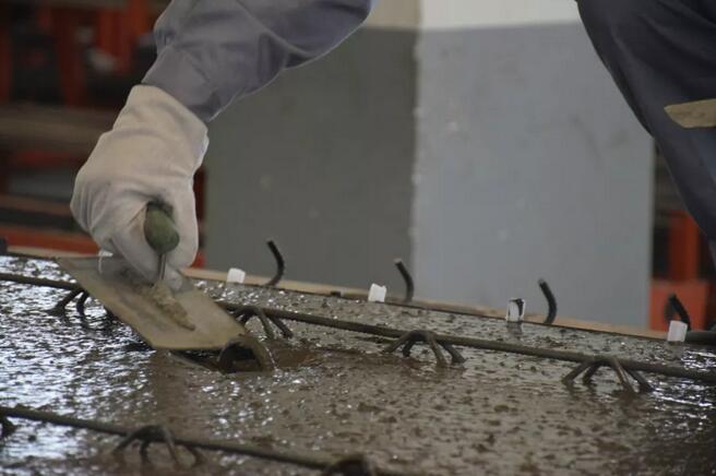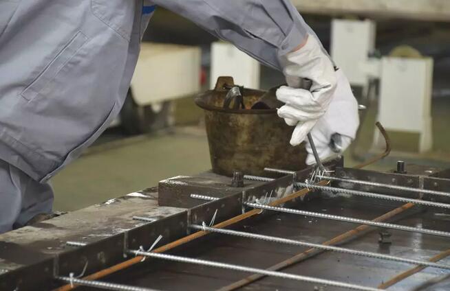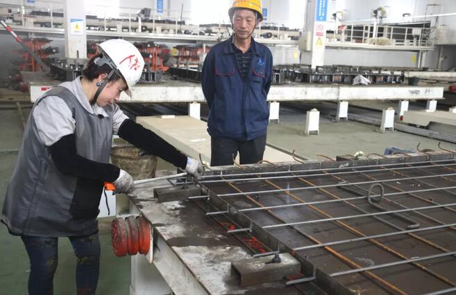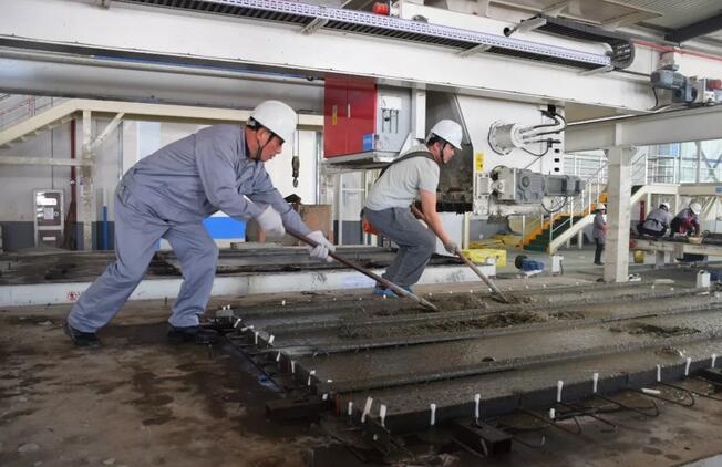 工廠里的布料機將混凝土鋪料完,振動臺振搗,使混凝土密實結合,消除混凝土的蜂窩麻面,提高強度。 完成這一系列工序后,張師傅又爬上了振動臺,仔細的進行補料和砼表面處理。張師傅說:“以前這些工序都是手工作業(yè),用震動棒、震動平臺板,在猛烈的電動機動力下,我們工人抓它的手臂被震得特別酸麻,吃飯時都幾乎端不起飯碗來。現(xiàn)在工廠實現(xiàn)了機械化、智能化生產(chǎn),大型的振動臺,上手更快,工作強度也小了,比以前輕松很多。”