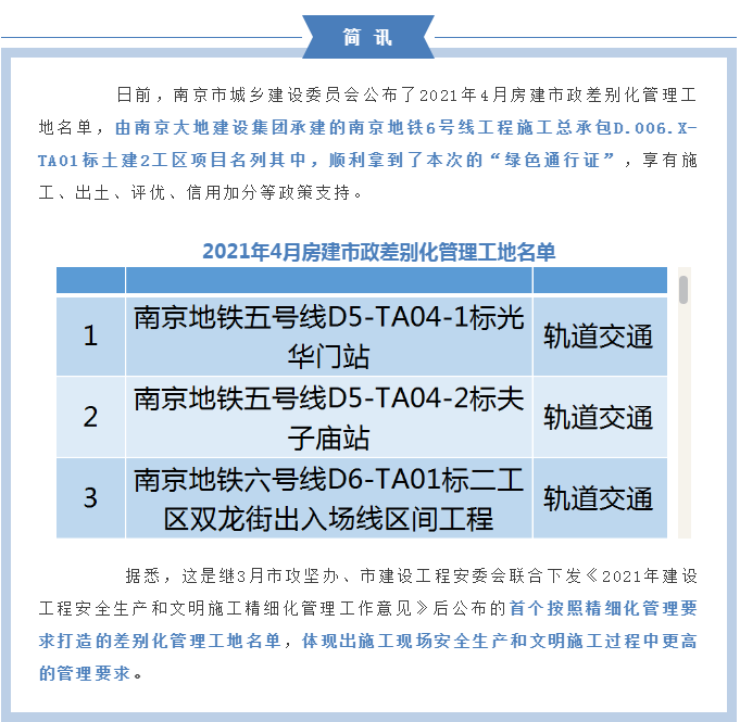 綠色通行證 | 公司地鐵六號線項目獲評“南京市差別化管理工地”