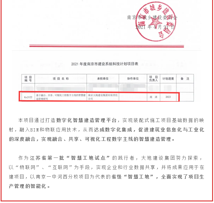 喜訊 | 公司研究項目被列為2021年度南京市建設行業(yè)科技計劃項目
